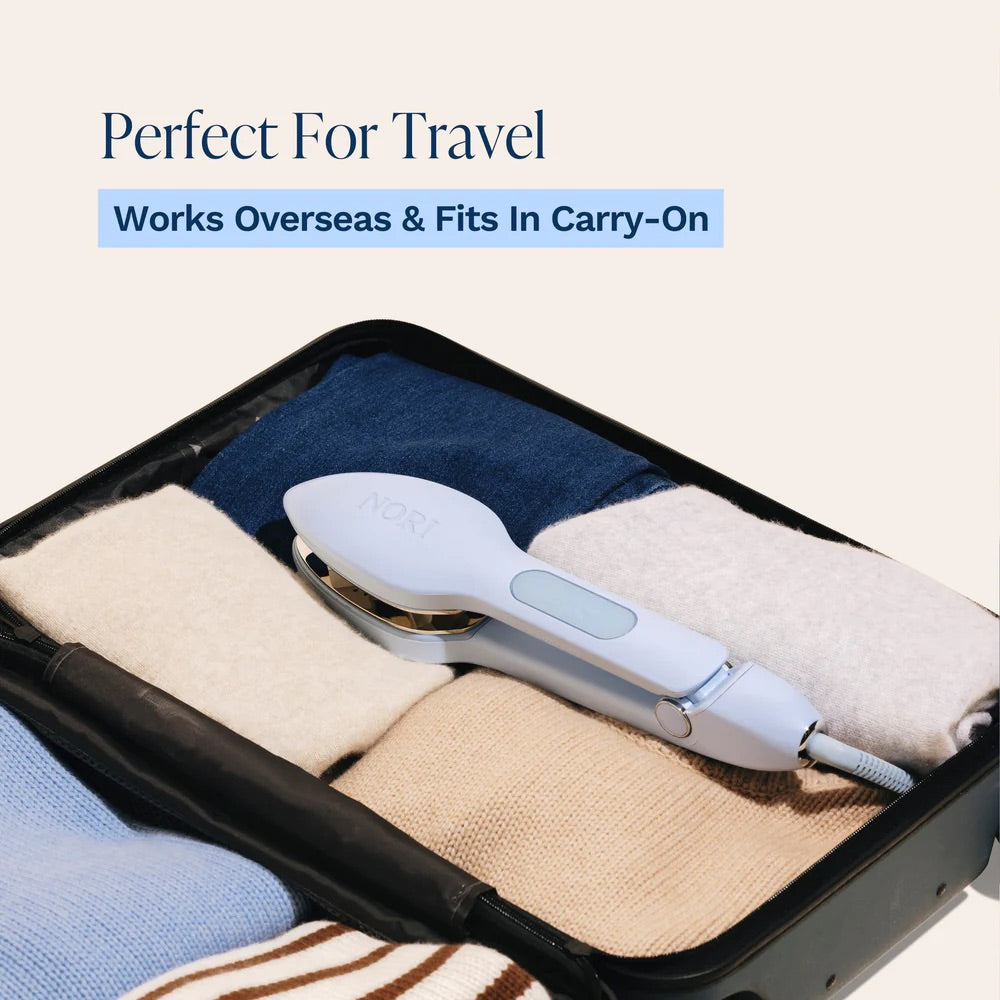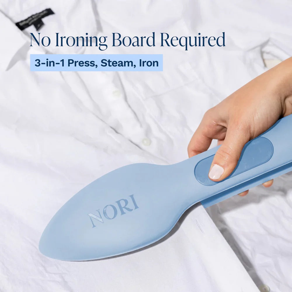The Nori Press is a handheld steam iron that requires no ironing board. It features six fabric-specific heat settings, a steam function, elongated arms for better reach, and dual heated aluminum plates that press both sides of a garment at the same time.