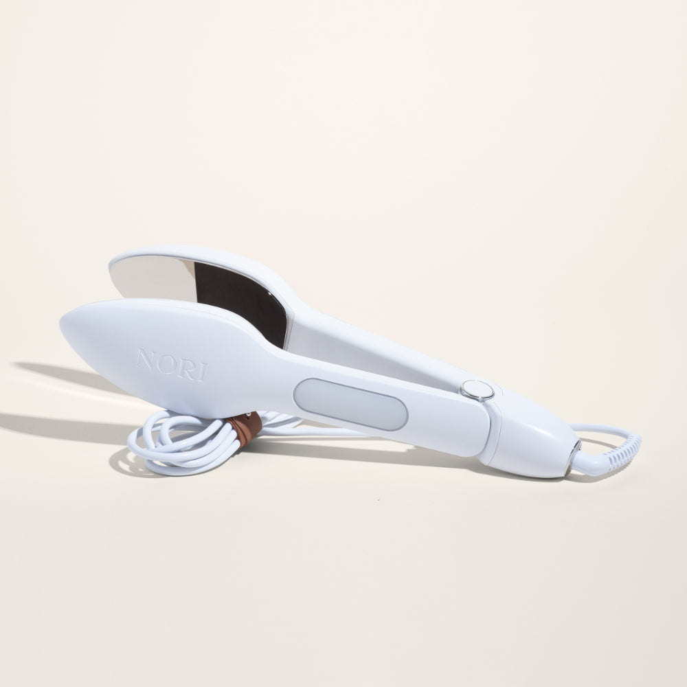 The Nori Press is a handheld steam iron that requires no ironing board. It features six fabric-specific heat settings, a steam function, elongated arms for better reach, and dual heated aluminum plates that press both sides of a garment at the same time.